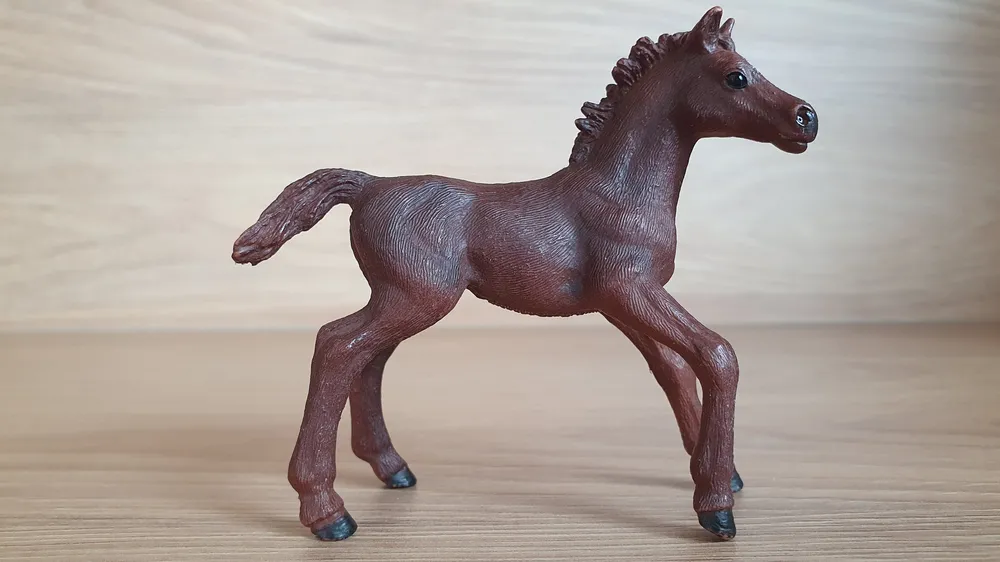 Schleich 13857 Anglický plnokrevník hříbě, odřeniny. Rok výroby vyznačený na zvířátku: 2016, oficální ukončení prodeje: . Jedná se o použité zboží. Fotografie jsou autenické.