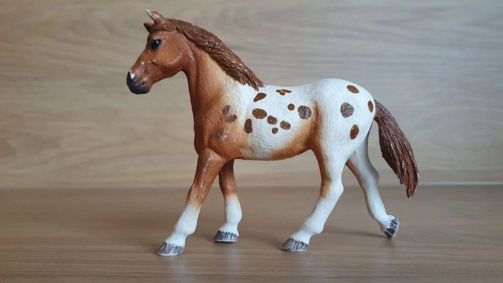 Schleich 42433 Appaloosa klisna, hodně odřený. Rok výroby vyznačený na zvířátku: 2017, oficální ukončení prodeje: . Jedná se o použité zboží. Fotografie jsou autenické.