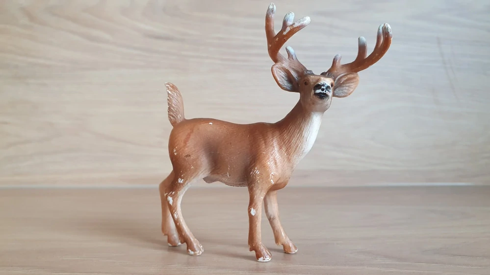 Schleich 14253 jelenec, hodně odřený. Rok výroby vyznačený na zvířátku: 2002, oficiální ukončení prodeje: 2014. Jedná se o použité zboží. Kupujete přesně to, co je na fotkách. Fotografie jsou autentické.