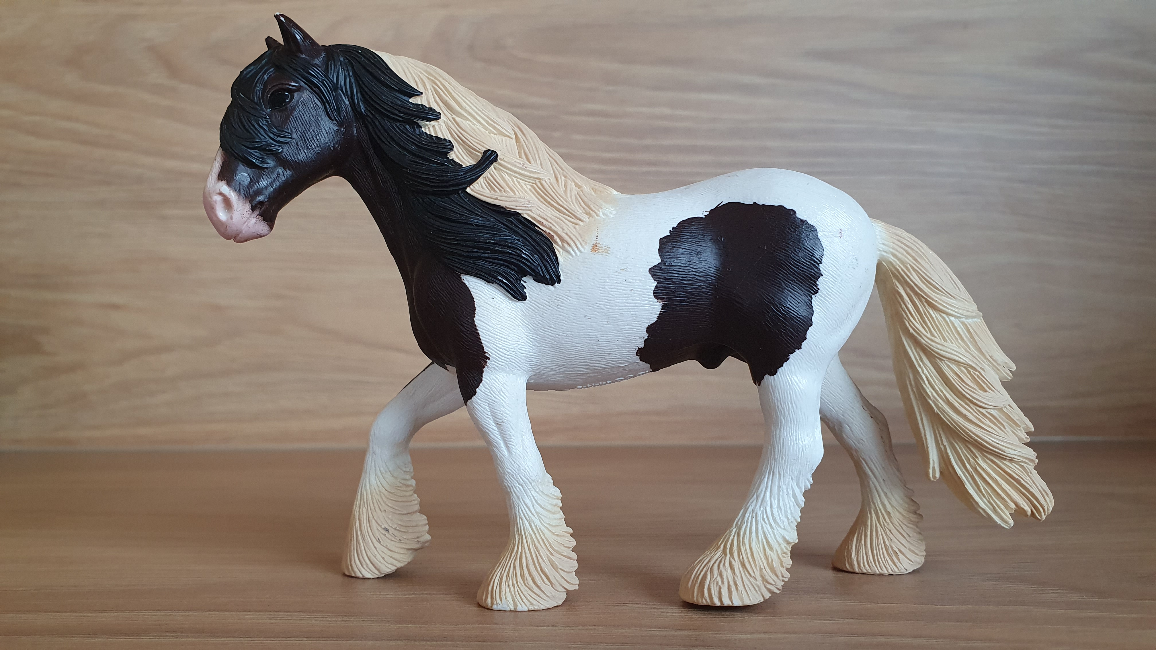 Schleich 13831 Tinkerský hřebec, odřeniny. Rok výroby vyznačený na zvířátku: 2016, oficální ukončení prodeje: . Jedná se o použité zboží. Fotografie jsou autenické.